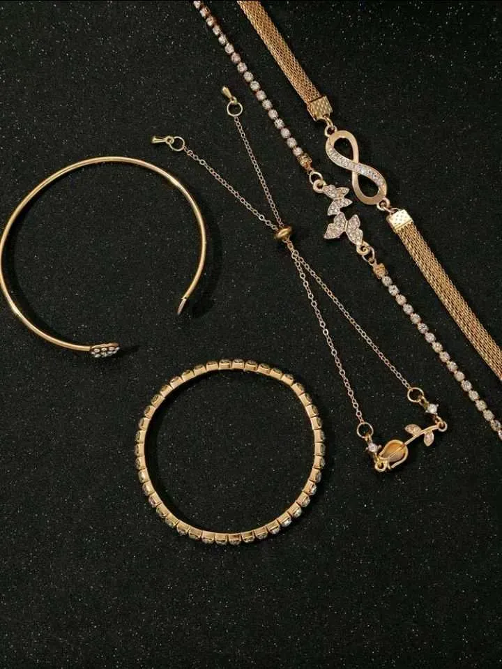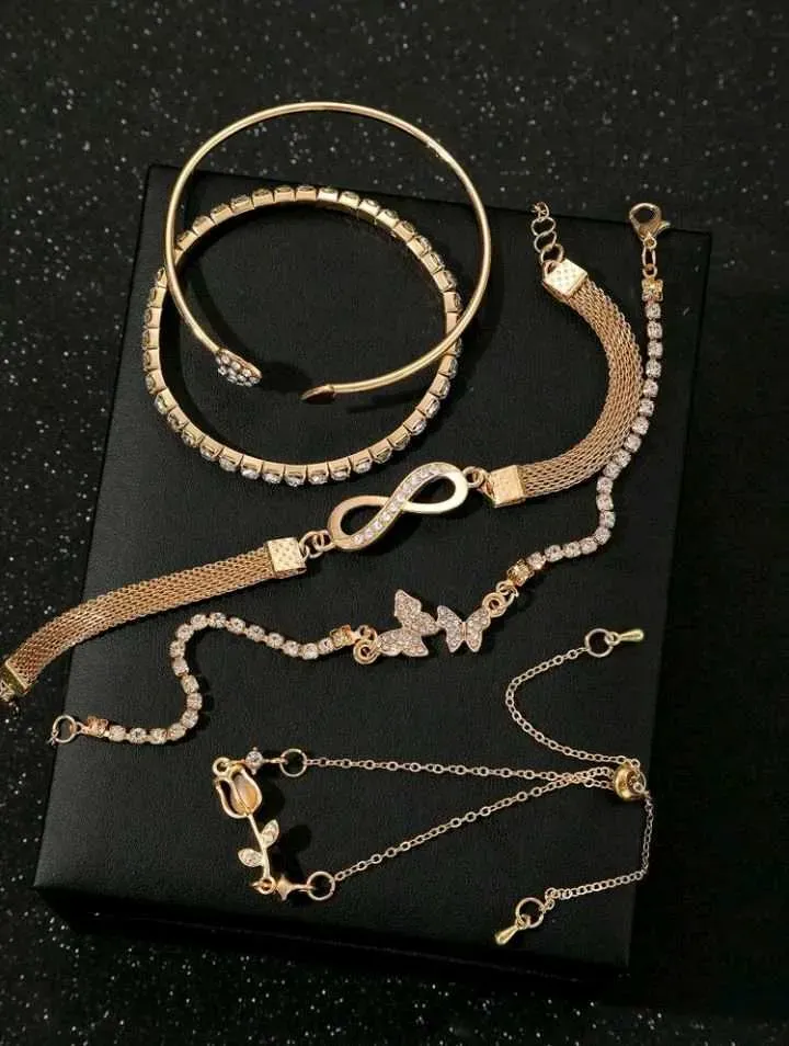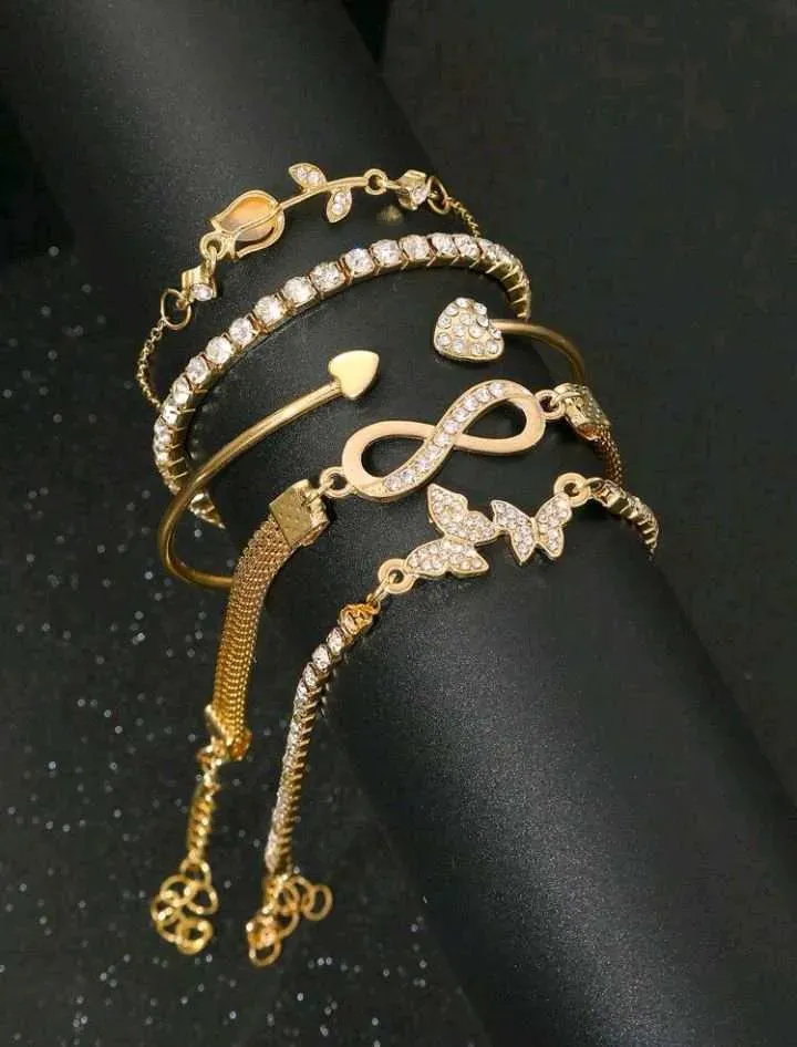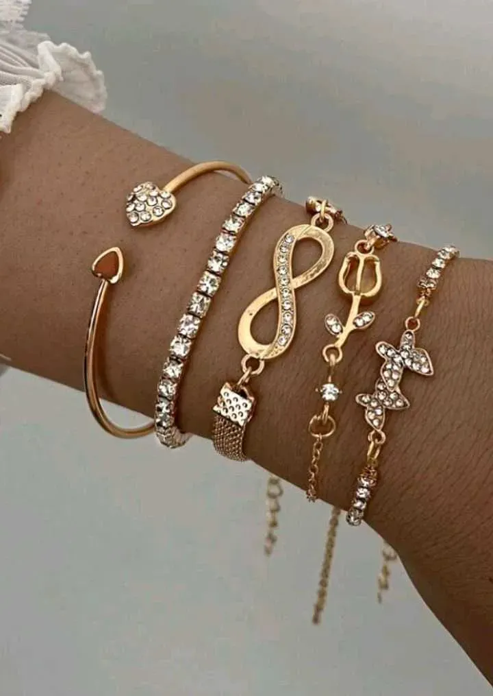 Set de 5 brazaletes y pulseras elegantes y minimalistas con diseños de mariposa, corazón, flor, tulipán y cristal, adecuado para fiestas, citas, uso diario y como regalo.